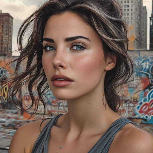 A young woman with long brown hair stands against a vibrant graffiti wall, her serene expression and alluring gaze captivating the viewer. The contrast between her soft features and the rough texture of the art creates a striking visual, highlighting her inner strength and confidence.