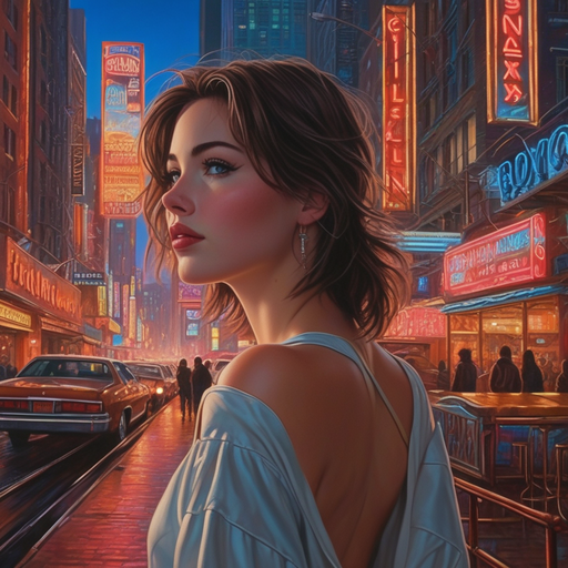 A young woman with dark hair and blue eyes stands amidst the bustling city street at dusk, her light blue shirt unbuttoned, revealing her shoulders. The city is alive with neon signs and streetlights, creating a romantic and mysterious urban scene. The dramatic effect of light and shadow adds to the allure, with the woman lit from the front, while the city behind her remains shrouded in darkness.