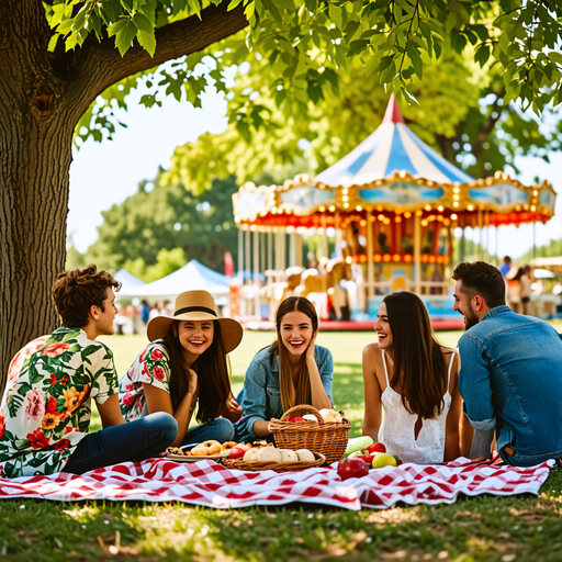 Capture the joy of friendship with this heartwarming scene of four friends sharing a picnic in a sunny park. The carousel in the background adds a touch of whimsy, creating a lighthearted and carefree atmosphere.