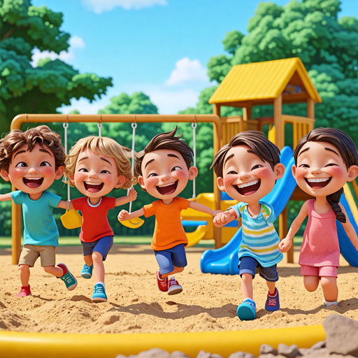 Five cartoon children, beaming with happiness, hold hands and run in a line across a vibrant playground. The scene captures the carefree spirit of childhood with its bright colors, playful design, and joyful expressions.