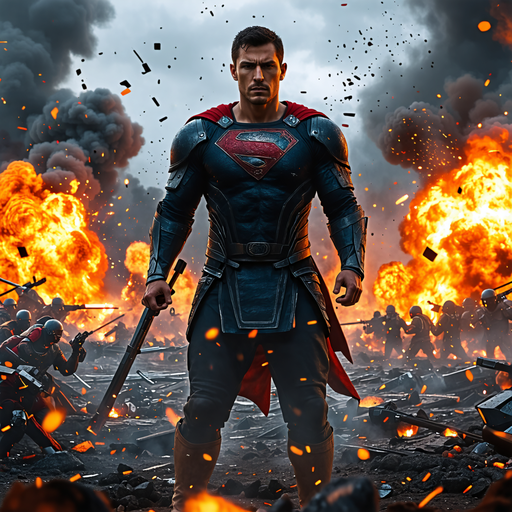 Shot : A muscular Superman, clad in dark armor and a red cape, stands amidst a fiery battlefield, surrounded by explosions and soldiers. The image has a cinematic feel, with the subject in the foreground and the chaotic background contributing to a sense of drama.