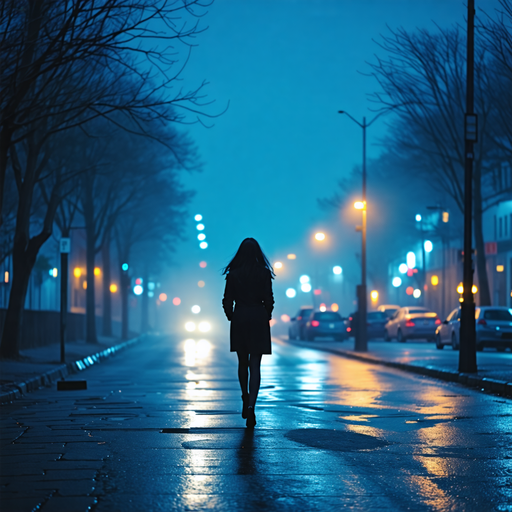 A haunting image of a lone woman walking through a foggy city street at night, bathed in the ethereal glow of streetlights. The silhouette against the blue-tinged mist evokes a sense of mystery, loneliness, and somber reflection.