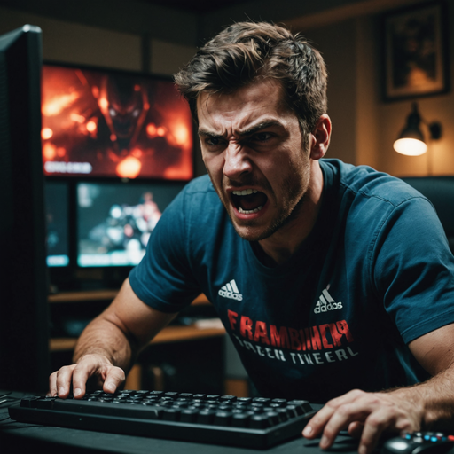 facial-expressions Anger: Frustration and rage ; A gamer, smashing his keyboard in a fit of rage; close-up; Gamer; A dimly lit room, with a computer screen displaying a game over screen; cinematic