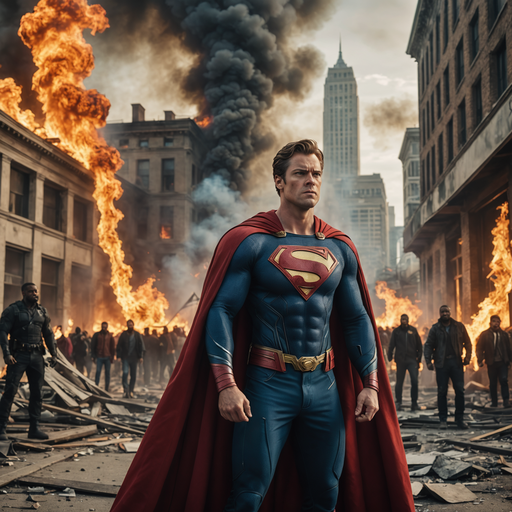 facial-expressions Disagreement: Urgent, conflicted, determined ; A superhero, cape billowing in the wind, standing in front of a burning building, looking at a group of people fleeing; eye-level; Hero; City skyline with smoke and flames; cinematic
