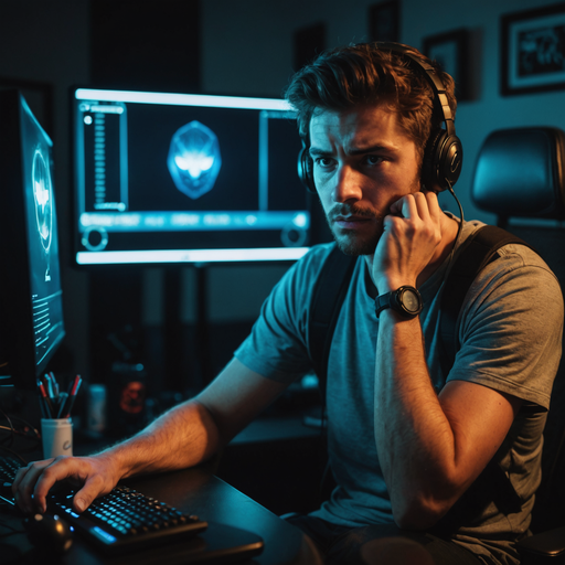A man sits before his computer, headphones on, bathed in the blue glow of his monitor. His expression is thoughtful, revealing a deep concentration as he navigates the complexities of his work. The scene captures the essence of focused intensity, a moment of quiet contemplation in the midst of a demanding task.