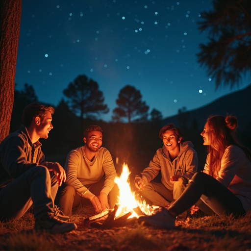 Four friends gather around a crackling campfire, their smiles reflecting the warmth of the flames and the camaraderie of their bond. The starry night sky above adds a touch of magic to this cozy scene, creating a moment of pure joy and togetherness.
