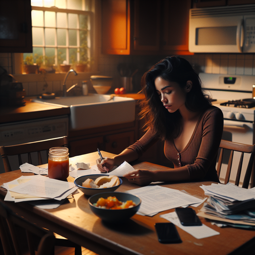 A young woman finds focus amidst the chaos, pensively reviewing paperwork in a warm, intimate kitchen setting. The cluttered table and soft lighting create a sense of domesticity and quiet reflection.