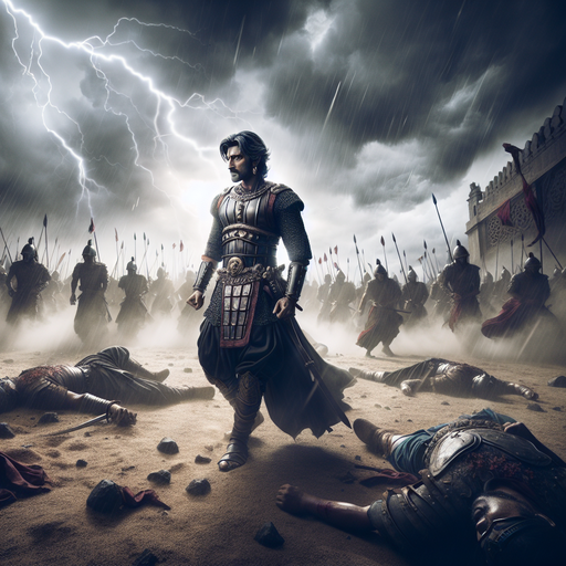 Shot : A lone warrior stands triumphantly amidst a battlefield, with fallen soldiers scattered around him. The sky is filled with stormy clouds, and lightning strikes in the background. The warrior is wearing armor and carrying a sword, and his expression is one of determination.