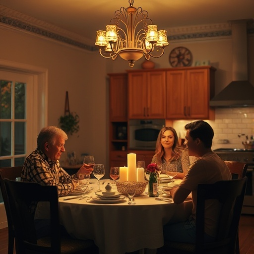 lightning practical-lighting: Intimate, heartwarming ; A family gathered around a dinner table, illuminated by the soft glow of a chandelier; studio; Normal People; A cozy kitchen with warm, inviting colors; cinematic