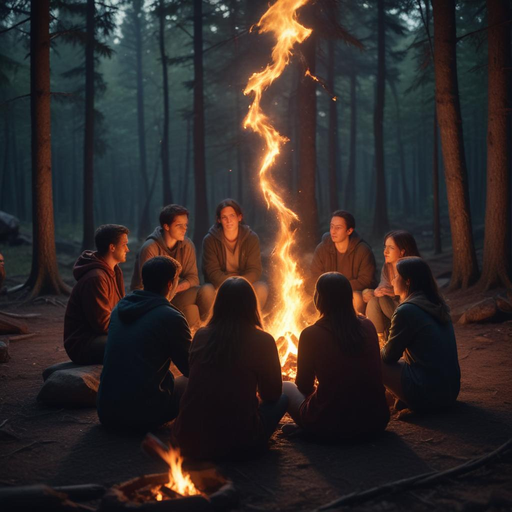 lightning low-key-lighting: Warm, intimate, nostalgic ; A group of friends huddled around a campfire, their faces illuminated by the flickering flames; medium-shot; Normal People; A dark forest with a campfire burning brightly in the center.; cinematic