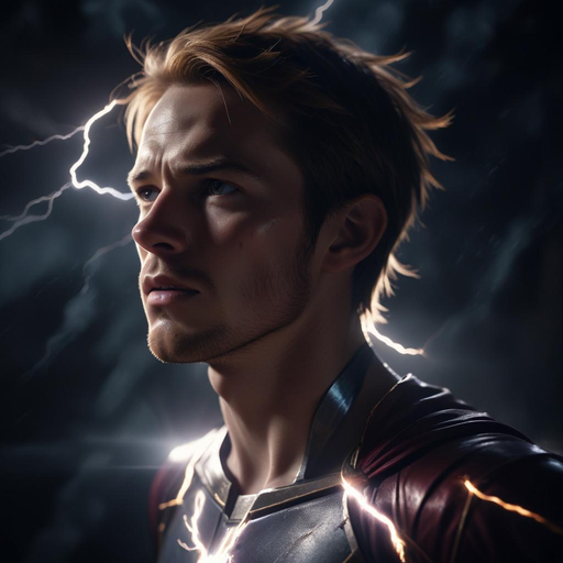 This image captures a superhero standing in a dramatic spotlight, surrounded by electrifying lightning effects. The scene evokes a sense of power, heroism, and intensity, making it a visually striking and emotionally impactful image.
