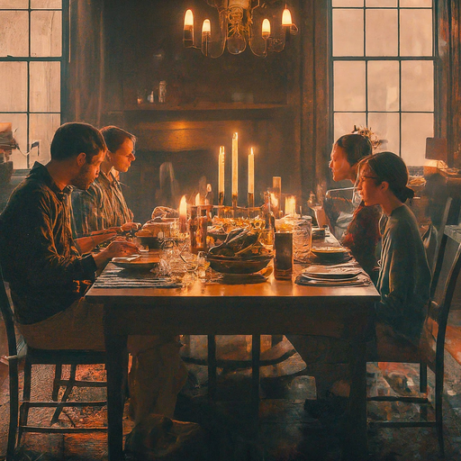 lightning ambient-lighting: Peaceful ; A family gathered around a dinner table, illuminated by the warm glow of candlelight; medium-shot; Normal People; A cozy dining room with a table set for dinner; cinematic