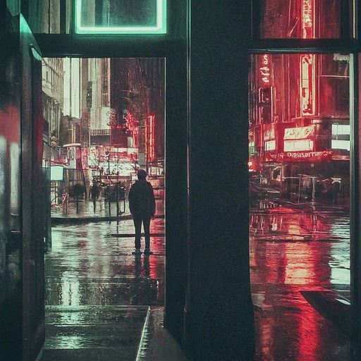 A solitary figure stands silhouetted in a doorway, gazing out at a rain-soaked city street bathed in the glow of red neon signs. The image evokes a sense of urban solitude and mystery, with strong contrasts of light and dark creating a dramatic and atmospheric mood.