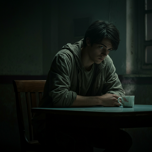 A young man, shrouded in the soft glow of a dimly lit room, contemplates the world outside through a window. The steam from his tea curls upwards, mirroring the swirling thoughts in his mind. This evocative image captures a moment of quiet introspection, tinged with a sense of mystery and melancholy.