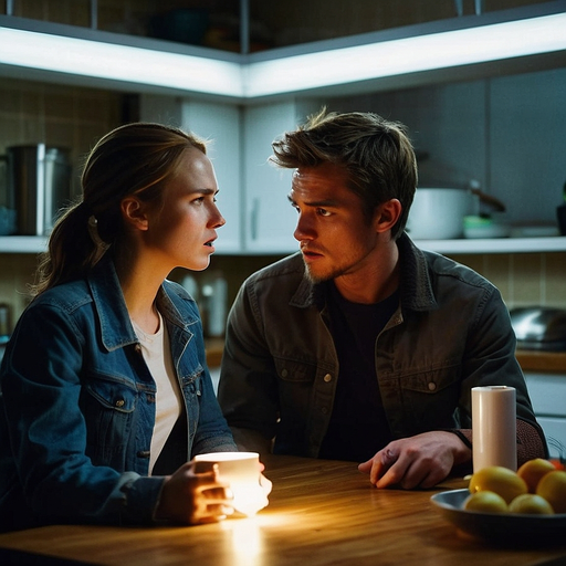 In this gripping scene, a man and a woman engage in a tense conversation, their faces illuminated by a single light source. The dramatic effect of the lighting heightens the intimacy and tension, drawing the viewer into their emotional exchange.