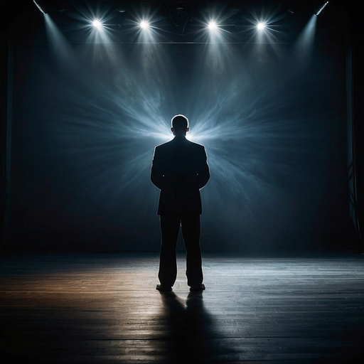 A solitary figure stands bathed in the dramatic glow of spotlights, creating an atmosphere of intrigue and introspection. The interplay of light and shadow adds a layer of mystery, leaving the viewer to ponder the story unfolding on stage.