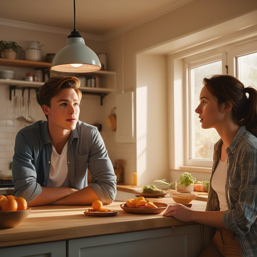lightning hard-lighting: Tense, confrontational, emotional ; A young couple arguing in a brightly lit kitchen, their faces illuminated by the harsh light of the overhead lamps; medium-shot; Normal People; A modern kitchen with bright overhead lamps.; cinematic