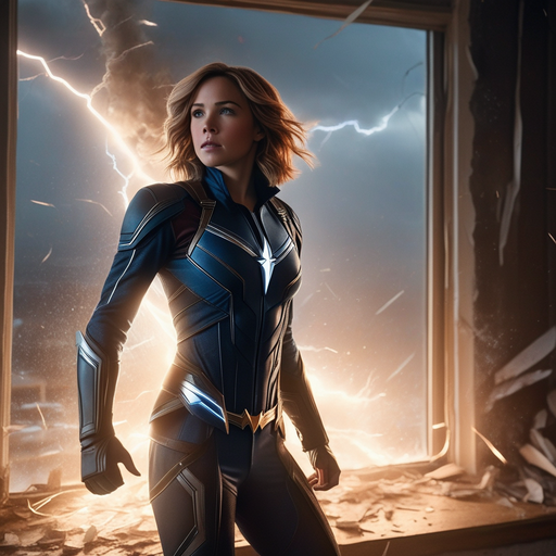 A powerful image captures a superhero, silhouetted against a stormy sky, ready to face whatever challenges lie ahead. The broken window and dramatic lighting create a sense of tension and anticipation, while the woman’s confident pose suggests hope and resilience.