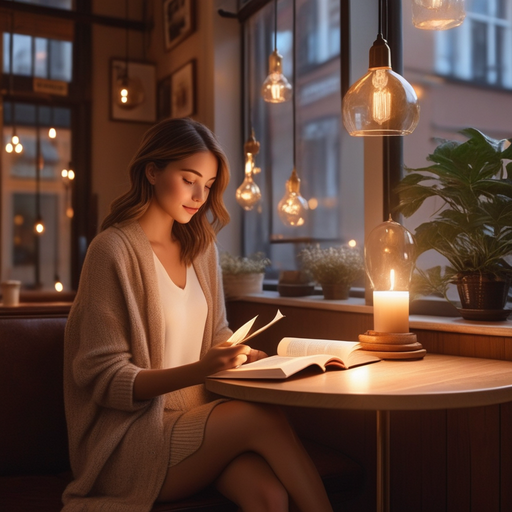 lightning motivated-lighting: Peaceful, intimate, cozy ; A young woman reading a book in a cozy cafe; medium-shot; Normal People; A warm, inviting cafe with soft lighting from lamps and candles.; cinematic