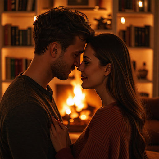 lightning soft-lighting: Intimate, romantic ; A couple sharing a quiet moment, their faces illuminated by candlelight; medium-shot; Normal People; A cozy living room with bookshelves and a fireplace; cinematic