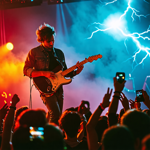 A rock musician commands the stage, bathed in dramatic lighting that amplifies the intensity of their performance. The crowd is captivated, mirroring the energy and passion radiating from the musician. This scene captures the raw power and emotion of live music.