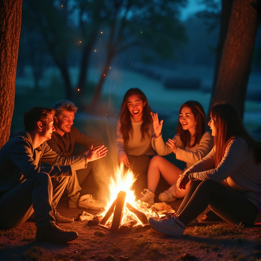 A group of friends gather around a crackling campfire, their faces illuminated by the dancing flames. The scene exudes a cozy and friendly atmosphere, capturing the essence of shared laughter and relaxed camaraderie.