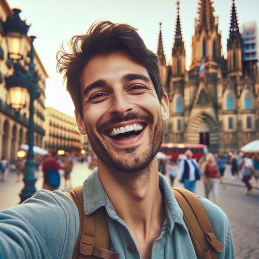 A young man captures the joy of travel with a selfie in front of a grand European church. His bright smile contrasts with the imposing architecture, creating a sense of adventure and carefree spirit.