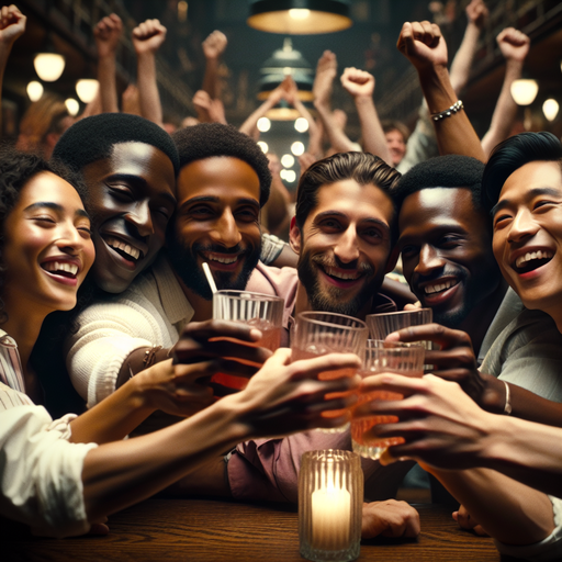poses embrace: celebratory, friendship ; A group of friends raising their glasses in a toast; close-up; groups; lively bar or restaurant setting; cinematic