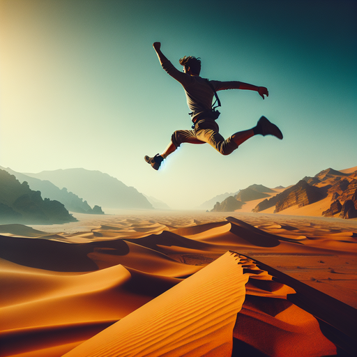 poses jumping: Excitement, freedom ; A lone adventurer; wide shot; Adventure; a vast, sun-drenched desert landscape; cinematic