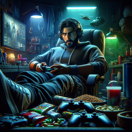 A man, immersed in a heated gaming session, sits in his dimly lit room, surrounded by gaming paraphernalia and snacks. The dramatic lighting creates a sense of depth and intensity, capturing the focused energy of a true gamer.