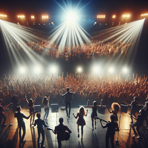 A vibrant scene unfolds as a band takes the stage, bathed in the glow of spotlights. The energy is palpable, with the crowd cheering wildly and the band feeding off the excitement. This aerial view captures the electrifying atmosphere of a live concert, showcasing the power of music to unite and inspire.