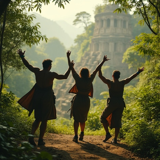 poses dancing: excited, adventurous ; A group of explorers; medium shot; adventure; a dense jungle with ancient ruins in the background; cinematic