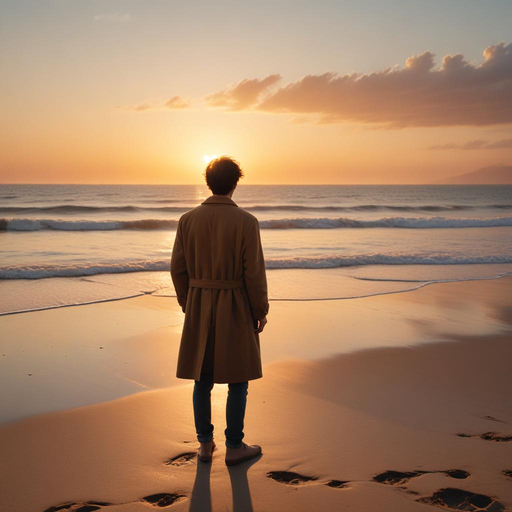Shot : A man stands alone on a beach, facing the ocean at sunset. The sky is a soft orange and pink, and the water is a calm blue.