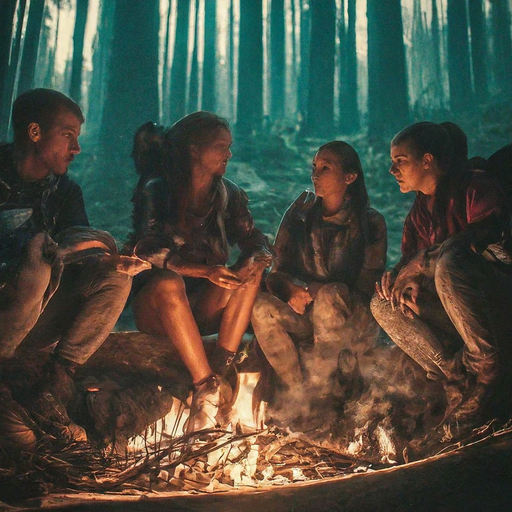 Four figures huddled around a crackling campfire, their faces obscured by the swirling smoke. The forest is dark, the air thick with an eerie silence. This image evokes a sense of mystery and intrigue, leaving you wondering what secrets lie hidden in the shadows.