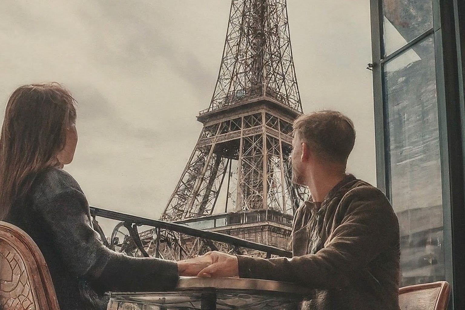 Shot : A couple sits at a table in a cafe, looking out at the Eiffel Tower.