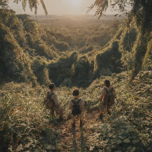 poses dutch-angle: adventurous, mysterious, awe-inspiring ; A group of explorers, silhouetted against the setting sun, standing at the edge of a vast, unexplored jungle; medium shot; adventure; lush green foliage and towering trees; cinematic