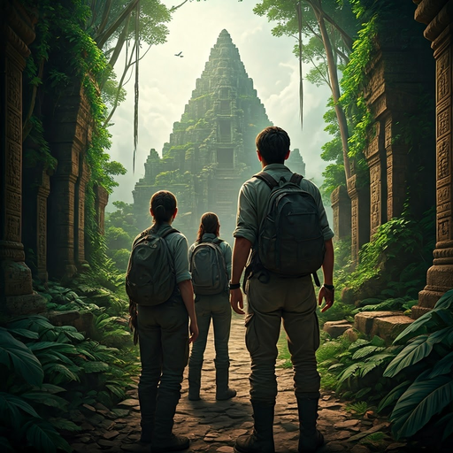 Three figures, a man and two women, embark on a journey through a lush, overgrown jungle, their destination: a majestic, ancient temple. The air is thick with mystery and anticipation, inviting you to imagine the adventures that lie ahead.