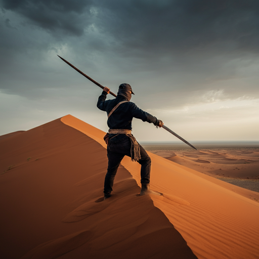 A solitary figure, armed with a spear, stands atop a sand dune, gazing out over a desolate and endless desert. The epic scale of the landscape and the figure’s isolated pose evoke a sense of adventure and dramatic isolation.
