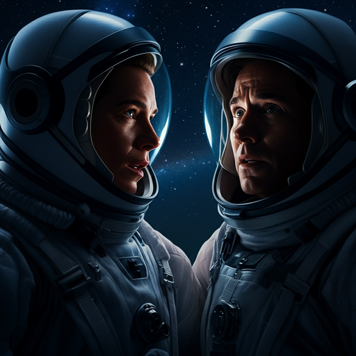 A tense silence hangs between two astronauts, their expressions hinting at a shared secret or a looming threat. The vast, star-filled backdrop amplifies the sense of isolation and suspense, leaving viewers wondering what lies ahead for these explorers in the unknown.