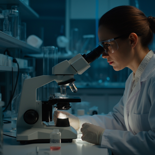 In a dimly lit laboratory, a scientist meticulously examines a specimen under a microscope. The image captures the intensity and focus of scientific research, with the subject in sharp focus against a blurred background. The bluish lighting adds a sense of professionalism and seriousness to the scene.