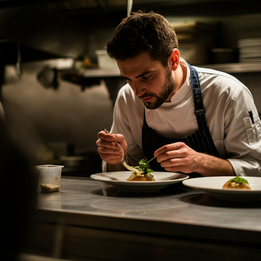 A close-up shot captures a chef meticulously plating a dish in a professional kitchen bathed in low light. The intimate setting and focused mood highlight the chef’s dedication to culinary artistry.