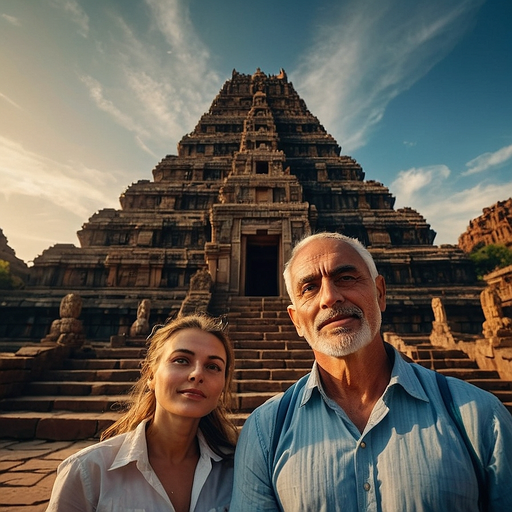 A couple stands before a grand stone temple, its imposing structure bathed in the warm glow of the setting sun. The scene evokes a sense of tranquility, adventure, and historical significance, capturing the awe-inspiring beauty of the ancient world.