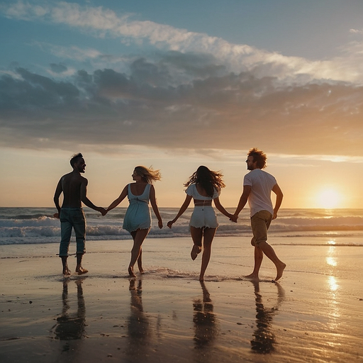 Four friends, hand in hand, stroll along a sun-kissed beach as the day fades. Their silhouettes against the vibrant sunset evoke a sense of warmth, nostalgia, and carefree summer joy.
