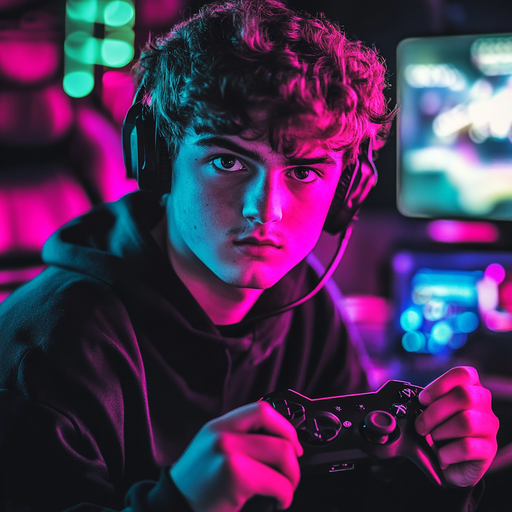 A young man, eyes locked on the camera, is immersed in a video game. Neon lights illuminate the scene, creating a dramatic contrast and a futuristic atmosphere. His intense focus and the vibrant colors capture the thrill of the game.