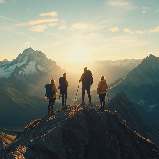 Four hikers stand in awe as the golden light of sunrise paints the mountain range in vibrant hues. A peaceful and adventurous moment captured, with long shadows adding a dramatic touch to the serene landscape.