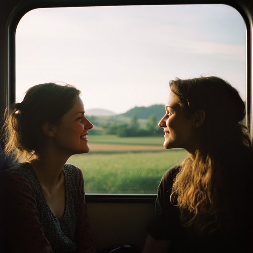Two young women share a warm and intimate smile on a train journey, their connection highlighted by the soft lighting and the blurry backdrop of passing scenery. The mood is joyful, carefree, and full of intimacy.