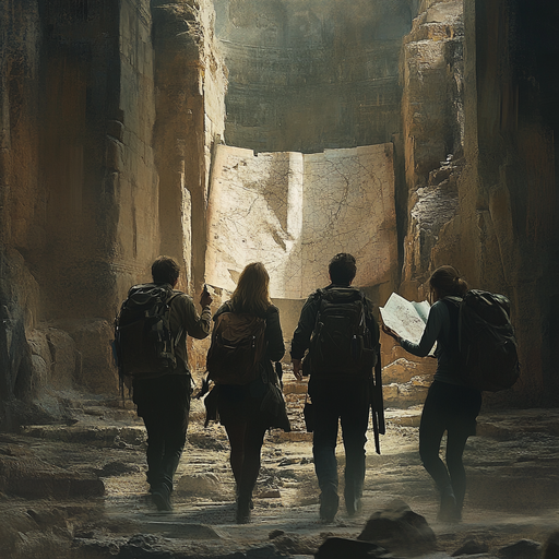 Four explorers venture into a rocky canyon, drawn towards a mysterious, white, rectangular object partially hidden by the walls. The play of light and shadow adds to the suspense, leaving the explorers’ fate and the object’s purpose shrouded in intrigue.