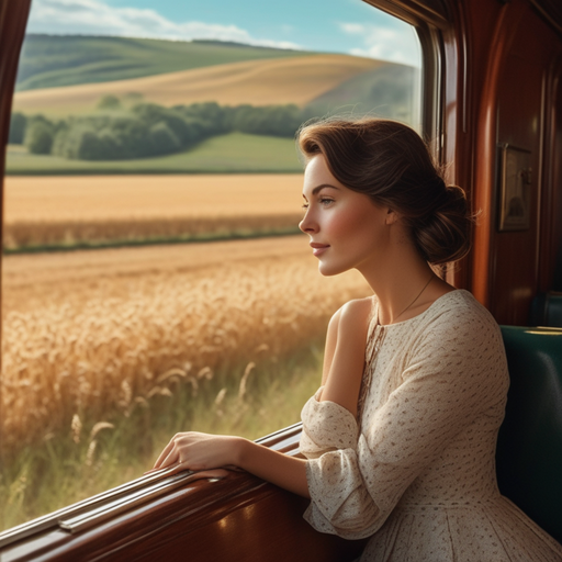 A woman gazes out the train window, her expression lost in thought as the sun bathes a field of wheat in golden light. The scene evokes a sense of nostalgia, dreaminess, and romantic longing.