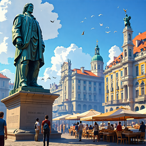A lively scene unfolds in this historical town square, where a grand statue takes center stage. The bustling market adds a vibrant energy to the scene, showcasing the rich history and lively atmosphere of this charming location.