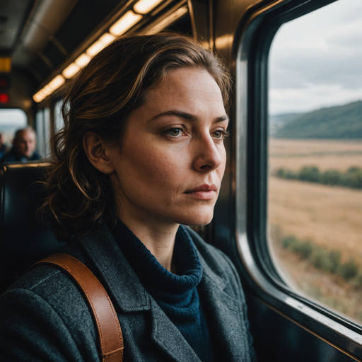 A woman, bathed in soft light, sits by a train window, her gaze fixed on the passing scenery. Her pensive expression and the muted colors of the scene evoke a sense of quiet introspection and contemplation. This image captures the fleeting moments of reflection that often accompany travel.